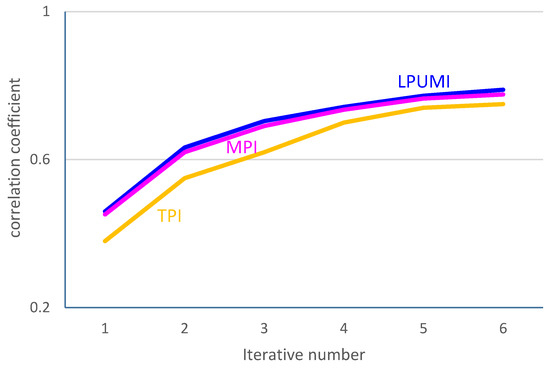 Gonzalez [8] pointed out that the accuracies of the inversion iterations can be compared using the absolute error recorded by the forward simulation or the seismic trace correlation. Due to the possible errors in the time–depth conversion, direct comparison may cause large errors. However, the underground reservoir prediction is more likely to reveal the sand body and the spatial structure of the interlayer. If the reflected structure is similar, the overall similarity of the seismic records will increase. Therefore, the correlation between the forward simulation records and the actual records was used to compare the results of the different methods. The correlations between the forward modeling records and the actual seismic track were calculated. The results show that the correlation coefficient of the TPI is 0.72. The correlation coefficient of the MPI is 0.74, and that of the LPUMI is 0.77. This demonstrates that the LPUMI results are closer to the actual seismic record and have a higher accuracy.