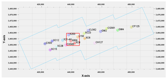 Drilling distribution map of the actual working area and the location of the inversion block.