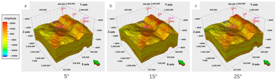 Pre-stack seismic track set for the inversion block: (a) 5°, (b) 15° and (c) 25°.