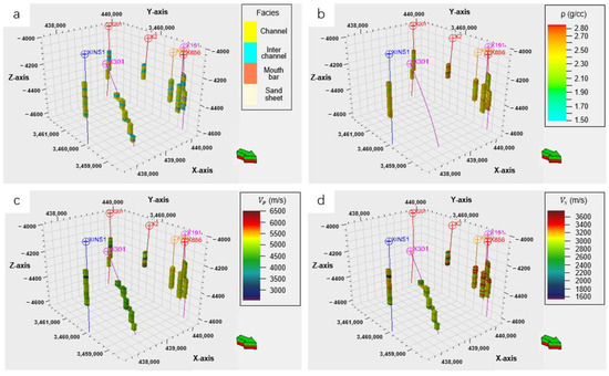 Data interpretation results for the 11 wells in the inversion block: (a) lithofacies, (b) density, (c) p-wave velocity, and (d) s-wave velocity.