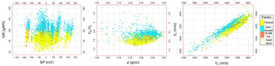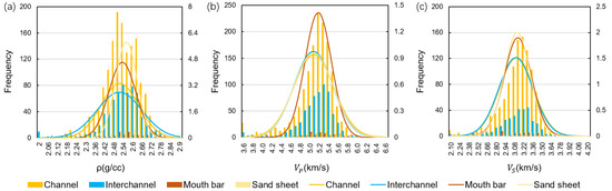 Analysis of the elastic parameters of the different lithofacies in the wells: (a) density, (b) p-wave velocity, and (c) shear wave velocity.