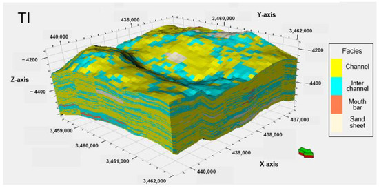In this study, three methods, including the TPI, MPI, and LPUMI, were applied to the prediction of the sand formation in the study area. Because this was mainly undertaken to test the proposed inversion method and compare it to the two existing methods, the inversion prediction was not performed for the entire region. Instead, a relatively regular local area with a relatively simple stratigraphic structure and no-fault development was selected to carry out the study. The total thickness of the vertical direction of the intercepted area is about 235 m, and the length in the I direction and J direction on the plane is about 4000 m (Figure 9). The grids were 100 × 100 m in the plane and 2 m in the vertical direction, and the total number of simulated grids was 40 × 40 × 118 = 188,800. Figure 10 shows the pre-stack track sets at different angles (5°, 15°, and 25°) in the test block. Figure 11 shows the spatial distribution and attribute interpretation for 11 wells. The analysis shows that the main body of the channel is composed of sand and silt, with little mud. The p-S wave velocity has an obvious linear relationship, with a small p-S wave velocity ratio and a low gamma ray (GR) value. The interchannel region is mainly composed of clay deposits with a small amount of silt and fine sand. The p-S wave velocity has an obvious linear relationship, with a high p-S wave velocity ratio and a high GR value. The mouth bar is composed of fine and silty sand, with fine sorting and a pure quality, and it has a small S-wave velocity ratio and low GR value, which is similar to the main body of the channel (Figure 12). The statistical analysis of the elastic parameter–lithofacies was conducted based on the data for these 11 wells, and its probability distribution was established for the elastic parameter sampling under lithofacies control during the subsequent inversion (Figure 13). The seismic wavelets from different angles were extracted based on the seismic records of the sidewalks (Figure 14). After comprehensive analysis, 25 Hz theoretical Rick wavelets were selected for the inversion seismic record synthesis. Based on geological analysis, a three-dimension training image of the study area was established (Figure 15), which was used to calculate the two-point variogram function and to extract the multi-point prior probability.