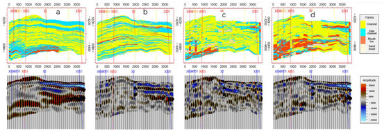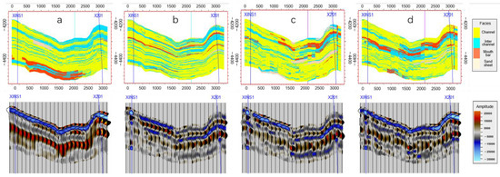 Furthermore, the cross-validation method was used to test and compare the methods. The cross section of well X853 was used to compare the prediction accuracies of the different methods. Both the MPI and LPUMI can reflect the characteristics of the upward transition of the mouth bar sand body, which is consistent with the migration trend of the lithofacies in the training image. However, the TPI can hardly reflect this characteristic. Compared with the actual seismic record, the synthetic seismic records of the MPI and LPUMI are closer to the actual seismic profile (Figure 17).