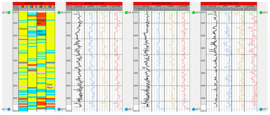 The inversion profile results obtained using the different method were captured for wells Xins1–X201 for comparison (Figure 16). As can be seen from the profiles, overall, all of the inversion lithofacies profiles are mainly composed of channel sand bodies. The mouth bar deposits are locally developed, and the mudstone deposits are relatively scarce and are mainly developed in the upper part. The lithofacies inversion is relatively continuous and the distribution of the channel sand body is reflected well. However, in terms of the structure, the sand body continuity of the TPI is too good to reflect the complex heterogeneity. The distributions of the MPI and LPUMI are highly variable and are connected locally, and the overall structure is close to that of the actual reservoir. In terms of the seismic track records, the inversion seismic records of the MPI and LPUMI are close to the actual seismic records, while the TPI exhibits chaotic reflection characteristics, which are quite different from the actual continuous lithofacies distribution. The results show that the MPI and LPUMI are able to reflect the sand body and elastic parameters better.