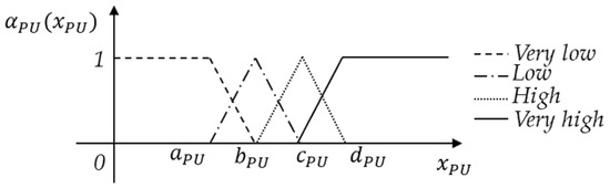 The membership function of the linguistic variable in the effectiveness of the processing system (PE) is presented in Figure 5.