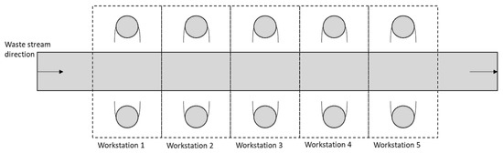 At each workstation, workers face each other and select the same types of waste. Table 2 presents the type of waste sorted at each workstation. Between the workers, there are chutes into which they throw sorted waste. In the case of workstations 2 to 5, apart from chutes, the workers have bags into which they throw fractions other than those thrown into the chutes.