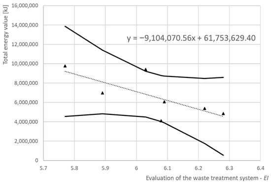 A case study is presented to demonstrate the use of the proposed method. The narrow range of EI results from performing the assessment on a selected portion of the system in several scenarios. When evaluating the whole system, a wider EI scope will be achieved. However, it is impossible to present the entire system as a case study due to its complexity and limited article length. We have presented the possibility of investigating the dependence of energy value on the system’s rating. When applying the method to another sorting system, one should follow the steps of our method and, finally, determine the energy dependence on the value of the grades obtained.