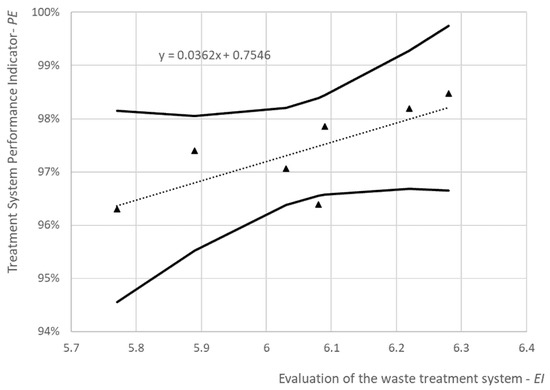 The purpose of a sorting plant is to separate economically significant recyclable materials from other materials. From this point of view, there should be a high correlation between the assessment value and the sorting efficiency of the system. This relationship is presented in Figure 10. The Pearson’s linear correlation coefficient is R x y = 0.756 for the rating and the percentage efficiency of waste sorting. The correlation at the presented level may seem low, but the obtained result seems reasonable from the decision-makers’ point of view. It should be noted that, on all workstations from 1 to 5, workers choose the blue PET fraction. It implies a significant difference between the purchase price of a ton of blue PET and the other fractions. From an economic point of view, there is a much higher concentration on selecting higher value materials. Therefore, HDPE is selected only at one last station. As a consequence, the efficiency of picking blue PET is higher than HDPE, for example.