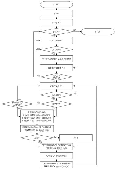 We will carry out the method for the velocity range of 1–60 km/h. The current of the electric traction motor has been determined for each velocity value when the traction power is achieved during the start, or the power is input to electric motors. The initial value of current was assumed in our calculations as 100 A raised with a step of 5 A. It was also assumed that at velocities less than 15 km/h, electric motors function without field weakening, while at velocities of 15–30 km/h, electric motors operate with a field weakening by 35%. Moreover, at velocities of higher than 30 km/h with a field weakening by 20%. The calculation is based on the technique referred to in [].
