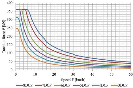 Estimated traction characteristics of the ChME3 locomotive by traction asynchronous electric motors (3DCP-8DCP—position number of the driver’s controller from 3 to 8 respectively). Source: own work.