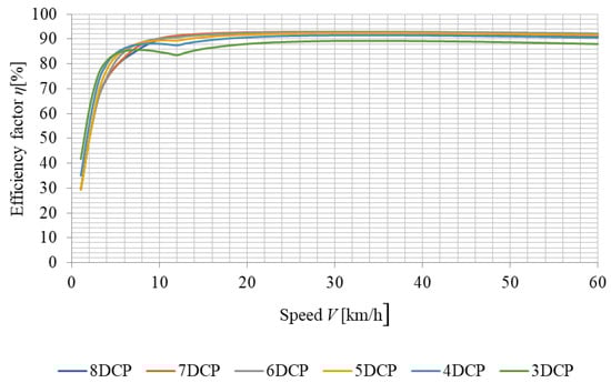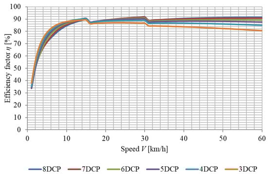 Table 6 shows the numerical values of efficiency within the speed range of 5–25 km/h for 3-8DCP. The tabulated values were calculated for the traction induction motor and gearbox with a gear ratio of 6.0 and 7.0.
