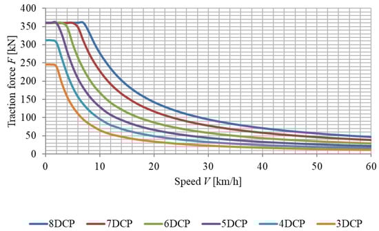 As mentioned in Section 3, the first step of the method is followed to determine the traction characteristics of the locomotive with DC electric motors. The initial data required for calculating the characteristics were determined according to the technical documentation for the ChME3 diesel locomotive (for example, [,], repair manual and others). Figure 6 shows the calculated traction characteristics of the ChME3 locomotive on the driver’s controller positions (DCP).