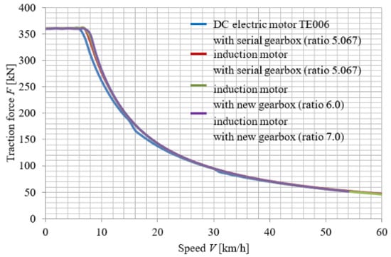 Figure 10 shows the traction characteristics of the ChME3 locomotive with the serial electric motors and asynchronous traction electric drive with different gear ratios of the traction gearbox. The traction characteristics of the ChME3 locomotive with traction asynchronous electric drive are higher than the traction characteristics of the locomotive with serial DC motors. This fact is due to the greater efficiency of the electrical asynchronous traction drive.