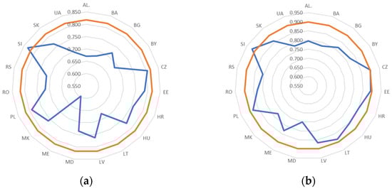 HDI index for EU-28 and CEE countries in (a) 2000 and (b) 2019. Red line—HDI in EU-28, blue line—HDI in EEC countries.