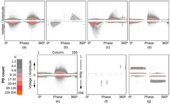 Examples of clearly defined PRPDs from the data set, each associated to the PD source: (a) internal void, (b) internal delamination, (c) DCI, (d) slot, (e) corona, (f) surface tracking, and (g) gap discharges. Figure adapted from [18] for convenience.