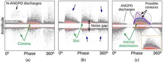 Because PRPDs are from online measurements, they are contaminated with many types of interference and noise [21]. All of the disturbances in the data sets of [18]—intense noise, crosstalk, and an ambiguous shape of PD clouds—were also present here. These disturbances, combined with the presence of multiple simultaneous sources, are exemplified by the PRPDs of the data set shown in Figure 3 and greatly increased the difficulty of automated PD recognition; such obstacles cannot be avoided and are very common in online measurements; therefore, any classification methodology to be of practical use must be robust enough to deal with them. The recognition methodology proposed in this study is able to tackle all these obstacles.