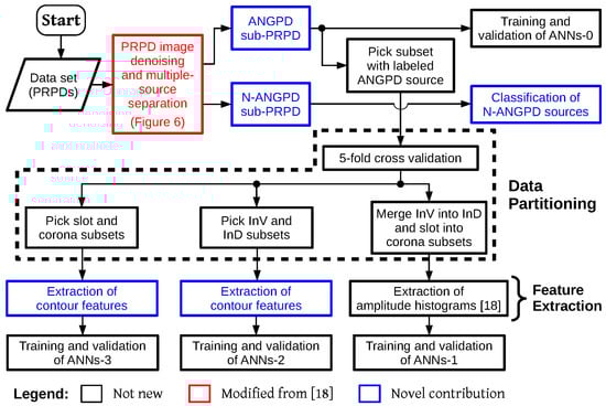 Flowchart of the multiple-source PD recognition methodology—training and validation stages. ANNs-0 are neural networks that detect whether the pattern’s ANGPD clouds are noisy; ANNs-1 perform preliminary separation with histograms; and ANNs-2 and ANNs-3 resolve between InV and InD and between slot and corona based on the contour feature, respectively.