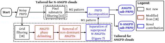 The separation of multiple sources was the last of a sequence of four steps focused on removing as much noise as possible from ANGPD clouds, producing a partially denoised pattern (Figure 6). There was a second filtering path tailored for preserving low-density N-ANGPD discharges (pattern ). In the current step of PRPD decomposition, illustrated by the namesake block in blue of Figure 6, and were combined to form two sub-PRPDs.