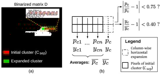 The horizontal clusters detected in the loop of thresholds underestimate the dimensions of superposed N-ANGPD clouds. For a more accurate estimation, the bounding box of each cluster was “expanded” using the following procedure, illustrated in Figure 9 for the pattern of Figure 8. Such expansion occurs iteratively in matrix D, in the vertical and horizontal directions, while the PDs within the expanded BB are distributed similarly to the PDs bounded by ’s original BB. For each column of ’s original BB, one calculates the proportion of the non-zero elements () relative to the total number of pixels in the column and the average of the row coordinates of the non-zero elements weighted by its values in matrix D (), as shown in Figure 9b. The averages of those metrics over all the columns of the original BB are and . In the horizontal direction, the BB’s left bound is shifted to the left, one column at a time, while the relative differences between the and values in the new column and and are less than 75% and 40%, respectively. The same is performed to the BB’s right bound. An analogous procedure was then applied in the vertical direction. The pixels within the expanded BB were estimated to form the actual N-ANGPD cluster (pixels in green in Figure 9a).