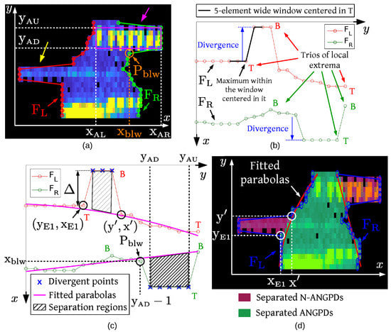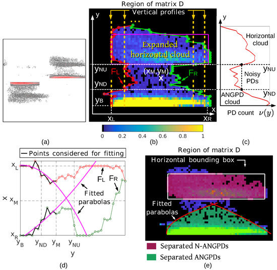 Using least squares, parabolas were fitted to the and curves disregarding the divergent points, as shown in Figure 11c. For each group of divergent points of the curve F ( or ), the PDs of y coordinates equal to the divergent points and not contained by the parabola fitted to F (to the left of the parabola if , or to the right if ) were removed from the ANGPD cluster and assigned to a new N-ANGPD cluster. The hatched areas in Figure 11c indicate the regions in which PDs were separated from the ANGPD cloud. Figure 11d shows the separation of superposed horizontal and ANGPD clouds.