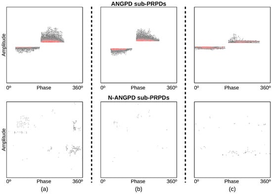 The second difference is that a new step of separation of multiple N-ANGPD discharges (Section 3.3) was added following the removal of non-dominant ANGPD s. The two filtering paths produced two partially denoised patterns and (Figure 6). The third and last difference is that, in this study, those patterns were combined to form two sub-PRPDs: one containing only N-ANGPDs, and the other formed only by ANGPD discharges (Section 3.4). In [18], a single PRPD containing only one dominant PD source was generated.