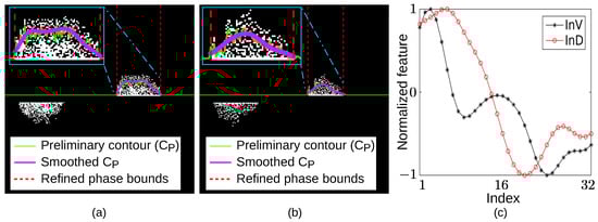 Before explaining how attributes are calculated, it is convenient to present some definitions. Let and be the columns of ANGPD cloud’s left and right phase bounds (e.g., vertical dashed lines in Figure 15), respectively. The height of PDs over a given phase interval is the 80th percentile of the values of smooth contour (Section 3.2) within this interval. The PD density is the proportion of non-zero PDs within a given phase interval and below the EMA-filtered rough contour (–Section 3.2).