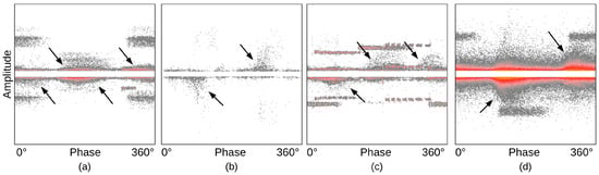 Examples of patterns with invalid ANGPD clouds. Such clouds present (a) low height, (b) low density, (c) low density compared to PDs in other phase angles, (d) low height compared to PDs in other phase angles. Arrows point to relevant ANGPD clouds.