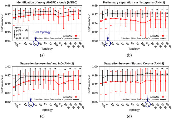 Topology-wise average (line) and standard deviation (vertical bars) of performances for each isolated system block. Statistics shown for all networks and for the set of 25% best ANNs from each CV partition. Blocks (a) identification of noisy ANGPD clouds; (b) preliminary separation via histograms; (c) distinction between InV and InD; (d) distinction between slot and corona. The best topology of each ANN type is indicated by arrows.