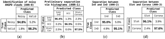 Element-wise average confusion matrices of the set of best topology’s 25% best ANNs from each CV partition, for each isolated system block. Matrices obtained from the test sets. Blocks (a) identification of noisy ANGPD clouds; (b) preliminary separation between InV/InD, DCI, and Slot/Corona; (c) distinction between InV and InD; (d) distinction between slot and corona.