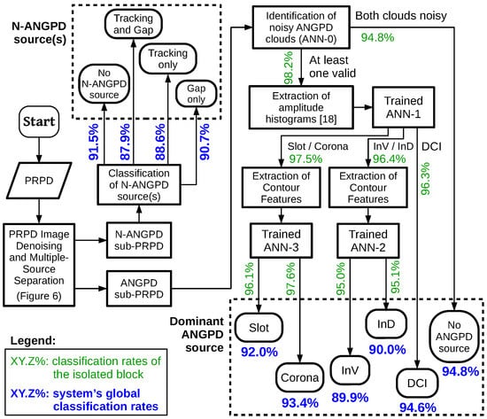 The testing stage is illustrated in Figure 5. An input pattern is subjected to the algorithm of noise removal and multiple source separation (Section 3.2 and Section 3.3). In the N-ANGPD sub-PRPD, one looks for surface tracking and gap PDs by comparing the dimensions and positioning of its clouds against predetermined thresholds. From the ANGPD sub-PRPDs, several metrics were extracted and used by the ANN-0 network to estimate whether ANGPD clouds are noisy or valid. If both clouds are deemed as noisy, it is considered that there is no ANGPD PD source in the pattern. If at least one cloud is judged valid, the pattern is classified by a cascade of trained networks ANN-1, ANN-2, and ANN-3. ANN-1 identifies the sample based on its amplitude histogram. If ANN-1’s output is DCI, this already is the system classification for the ANGPD PD source, since this class is characterized solely by the symmetry between positive and negative PDs (Table 1) [15,20]. If ANN-1’s output is InV/InD or slot/corona, contour features are calculated and passed to the corresponding auxiliary neural network (ANN-2 or ANN-3) to solve the ambiguity.