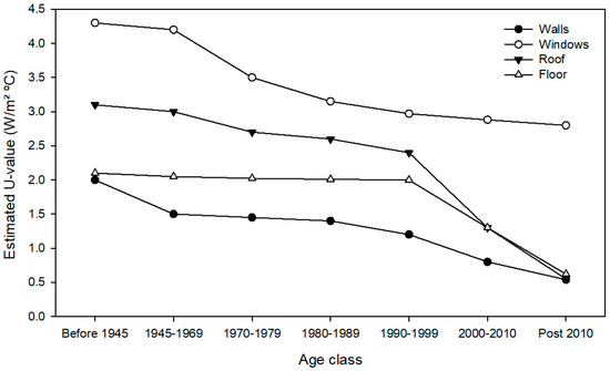 Estimated U-Value for building envelop elements of Portuguese building stock considering construction age class (data source [32]).