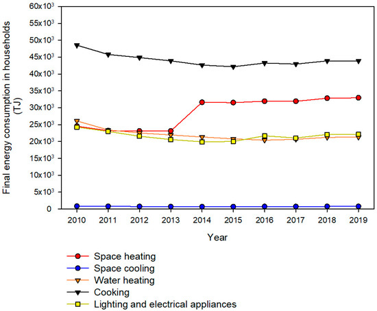 Figure 3 presents the residential building’s energy consumption concerning the last decade (2010–2019) [45]. It can be perceived that cooking was the prevalent energy consumption end-use (2010–2019 average, 37.7%), followed by space heating (2010–2019 average, 24.4%). It must be stressed that the space heating energy consumption for that decade was far above the EU average (which was approximately 60%).