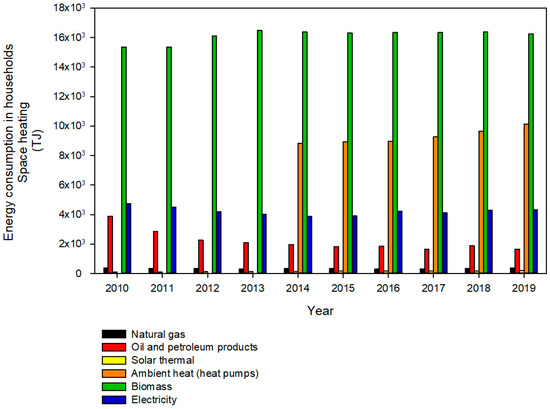 Analysis of the energy sources for household space heating show, as can be seen in Figure 4, that biomass was the primary source of energy used (2010–2019 average, 57.5%), noting however that heating heat pumps already represents a significant share of energy consumption in this type of use (30.7% in 2019), as well as electricity (2010–2019 average, 15.1%; however, it has been decreasing). Natural gas and solar energy show a reduced expression, as depicted in Figure 4 in (2010–2019 average, 0.5% and 1.2%, respectively).