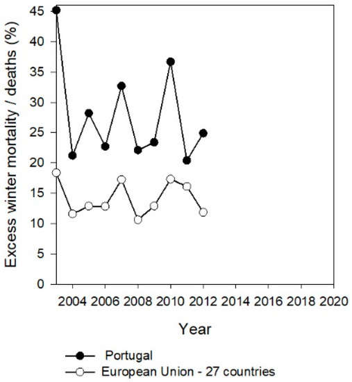 The adverse consequence of cold indoor temperatures to health has been under scrutiny and thus associated with increased blood pressure, asthma symptoms, cardiovascular and respiratory diseases, exacerbation of existing musculoskeletal problems, poor mental health, and slight illnesses such as colds and flu [6,7,8,9,10,11,12]. A positive association between EP and obesity was recently stated [47]. Cold homes may also contribute to excess winter mortality and morbidity (EWM), namely in the elderly population, attributed to both respiratory and cardiovascular disease [12]. According to the WHO, cold housing is expected to be responsible for 30% of the EWM in Europe [14]. Even though the studies relating to cold weather and morbidity/mortality are still scarce, EWM is supposed to be associated with housing quality and performance, especially thermal insulation [9].