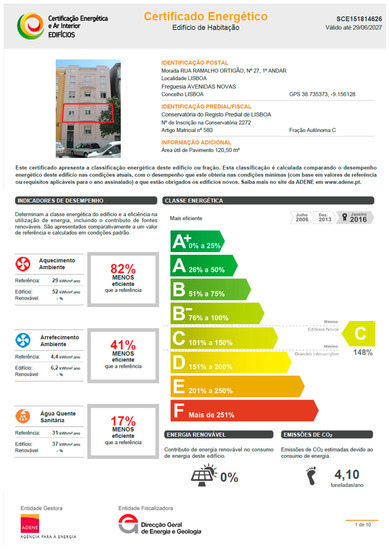 - Ferreira, J.; Pinheiro, M. In search of better energy performance in the Portuguese buildings—The case of the Portuguese regulation. Energy Policy 2011, 39, 7666–7683. [Google Scholar] [CrossRef]