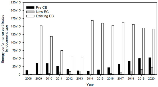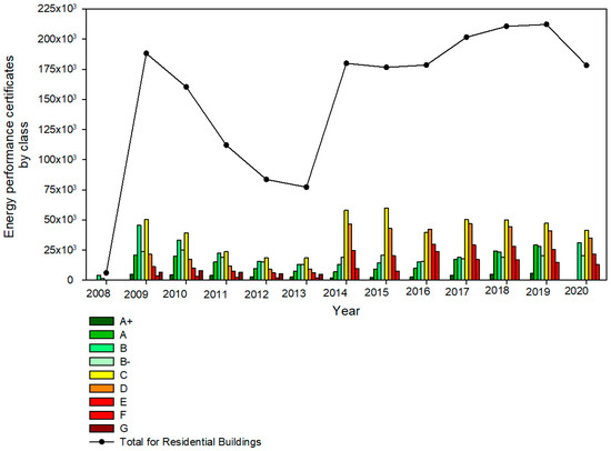 Nevertheless, at the end of the 2000s, despite low energy prices, concerns about GHG emissions also grew, emphasizing fossil energy resources. Thus, the United Nations approved the Kyoto Protocol in 1997, restoring GHG emissions from 2008–2012 to 1990 levels. EU countries agreed to achieve an 8% reduction in emissions compared to 1990, between 2008–2012, on a division at the country level and considering the development of the different economies. Besides meeting the Kyoto targets, in Europe, there was also the “Security of Supply” concern, in which Europe would import roughly 80% of its “energy” in 2020. In this context, Energy Performance in Buildings Directive (EPBD) was issued in 2002 by Directive 2002/91/CE 2002, aiming to improve the energy performance of buildings in the Community. This Directive obliged EU MS to impose the following requirements: (i) Methodology for calculating the energy performance of buildings; (ii) Minimum requirements for new buildings; (iii) Minimum requirements for major building renovations existing with more than 1000 m2; (iv) Energy certification of buildings in order to, among others, inform the citizens about the thermal quality of buildings when constructing, selling or renting them; (v) Regular inspection of boilers and air conditioning installations and, in addition, evaluation of the heating installation when the boilers are more than 15 years old. The EPBD also specified that the energy performance certification system (ECS) must embrace all residential and service buildings, public or private.
