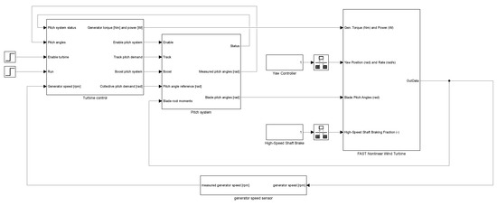 In order to test the ideas of Section 2.1, we have put together the model shown by Figure 2 for the production of synthetic data. It uses the DTU 10 MW reference wind turbine model [84,85] for OpenFAST version 2.3 [86] compiled for Simulink and a turbine controller written by one of the authors [87,88]. The turbine controller produces, as usual [89], generator torque and blade pitch angle references based on the generator speed. The torque reference is passed directly to the turbine model, because generator dynamics are besides the scope of this work, but the blade pitch angle reference is passed to a pitch system model, which then tries to track it with the actual pitch angles that are passed to the turbine model. The blade root moments calculated by OpenFAST are fed into this pitch system model to calculate the cylinder rod forces. The yaw and brake are left unused.
