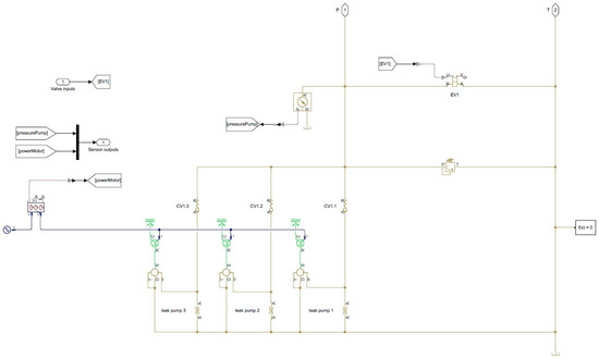 The power unit model is shown by Figure 4. It consists of three gear pumps in parallel, each driven by an induction motor directly connected to a 50 Hz, 400 V source. Note the orifices for pump leak simulation. The pumps supply, via check-valves, a pressure line, which is drained by solenoid valve EV1 when not energized. Thus, when the controller decides to top up the accumulators, it energizes EV1 to force the fluid towards the actuators. Evidently, when EV1 is not energized, one may perhaps in practice switch the motors off to save some energy. This does however not influence any variable we are interested in here, so we have omitted it.
