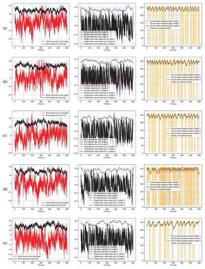 Results of some 10 min simulations with (a) nominal conditions, (b) a piston seal leak at blade 1, (c) extra friction at blade 3, (d) 50% loss of nitrogen at blade 1 and (e) 6 L/min loss of pump flow.