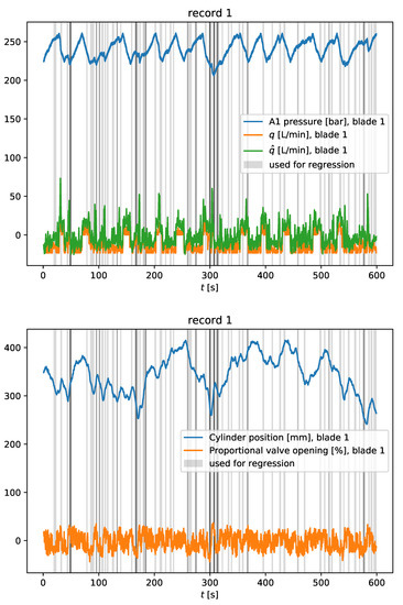 The simulation data were processed with Algorithms 1 and 2, which automatically cherry-picked the data, as shown by Figure 11, to calculate eight different parameters per blade and simulation. The cherry-picking is simple: we only took data points when the cylinder was moving in the same direction and the pumps were in the same state (on or off) for a few seconds, while we discarded bits where short, slow movements happened, or just after the pumps turned on or off. This keeps the relations assumed on Section 2.1 relevant.