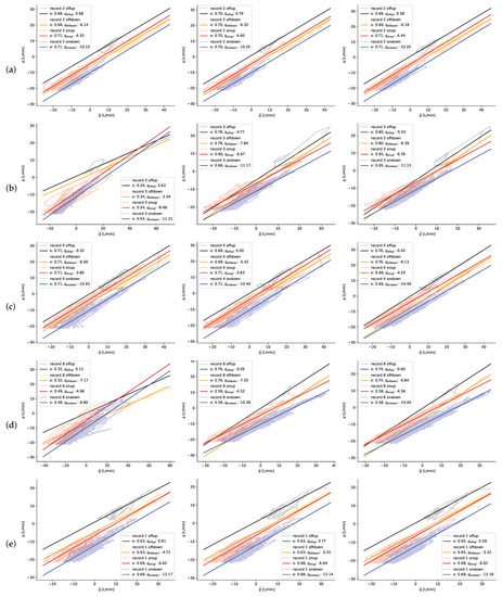 To deal with the inaccuracy caused in q by large, fast changes in cylinder chamber pressures, of which there must be one every time the actuator transitions from extension to retraction or vice versa, due to the regeneration imposing accumulator pressure on the rod side during extension—or in , by large, fast variations in gas temperature, of which there must be one every time the actuator transitions from pressurizing the accumulator to discharging it and vice versa, due to the accompanying reversion of heat flow—we can simply ignore data for a while after such transitions. Note that such cherry-picking of data points can be problematic in observer-based algorithms, but not here, since we are driving no observer or model with the data. From the rest of data, we expect a certain proportionality between q and , i.e.,