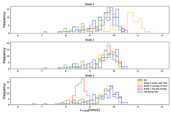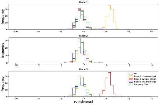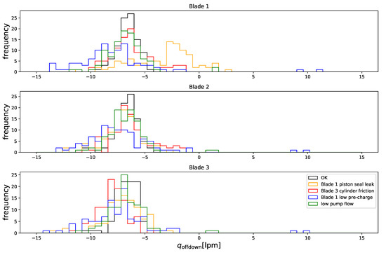 A total of 500 10-min simulations were carried out, 100 of which corresponded to nominal pitch system conditions, while another 100 corresponded to each of the failure modes considered here. The leaks were of approximately 6 L/min (in the case of the cylinder leak, this varies with load), which was less than 10% of the nominal flow rate supplied by the tree pumps together, i.e., 70 L/min. The accumulator gas leak was simulated by setting the nitrogen content of one of the accumulators to 50% of nominal. The extra friction was of 200 kN, which was about 25% of the force available per blade during normal operation.