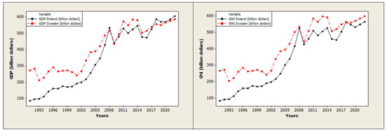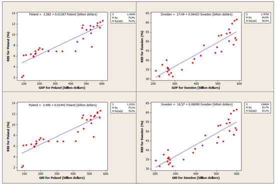 Correlations between GDP, GNI, and RES for both Poland and Sweden are very high. Relations between RES and GDP for Poland and Sweden (79.9% and 84.6%, respectively) indicate a good fit between the analyzed variables. The standard deviation for Poland and Sweden (S = 1.29549 and S = 3.79750, respectively) shows that GDP values are not dispersed widely around its average. Correlations between RES and GNI for Poland and Sweden (79.2% and 83.7% respectively) also point at an accurate fit between the variables. The GNI values for Poland and Sweden are not so dispersed around its average (S = 1.31521 and S = 3.89659, respectively), as is shown in Figure 3.
