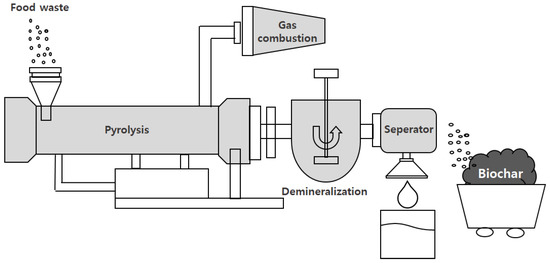 In South Korea, 14,000 tons of FW is generated per day on average, accounting for approximately 27.4% of MSW [7]. Some of this FW is dried and converted into feed, and some is subjected to composting for treatment. However, due to outbreaks of African swine fever and avian influenza in South Korea in 2019, FW can no longer be used as feed [8,9]. In addition, FW features limitations as a soil conditioner because its high salt concentration hardens soil [10]. Thus, a new method to treat FW is required. As the salt contained in FW generates dioxins or toxic substances during incineration, sufficient demineralization is essential during the production of biochar [11,12].