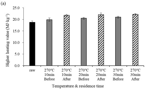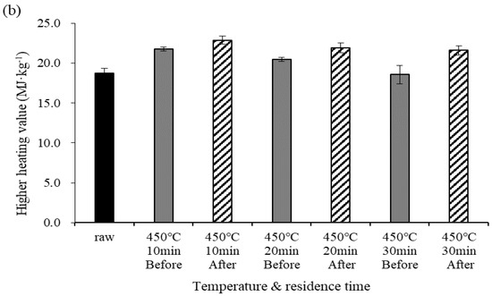 Figure 2 shows changes in the HHV before and after demineralization at different pyrolysis temperatures. Under the torrefaction temperature conditions (270 °C), the HHV before demineralization gradually increased as the residence time increased. Under the pyrolysis temperature conditions (450 °C), however, the HHV before demineralization slightly decreased at a residence time of 20 min. The NCV of the biochar increased with increasing temperature and residence time due to increases in the C content and salt removal. However, the NCV decreased at temperatures above 400 °C due to the pyrolysis reaction [5,7,24]. The differences in HHV before and after demineralization were 1.88, 1.53, and 1.25 MJ·kg−1 for residence times of 10, 20, and 30 min, respectively. At 450 °C, the differences in HHV before and after demineralization were 1.10, 1.67, and 0.77 MJ·kg−1 for residence times of 10, 20, and 30 min, respectively. Under both temperature conditions, NCV was higher after demineralization than before. The NCV increased if the C content in the elemental component surged because it was closely related to the C content; the NCV also increased due to the removal of salt from the biochar [5,25,26].