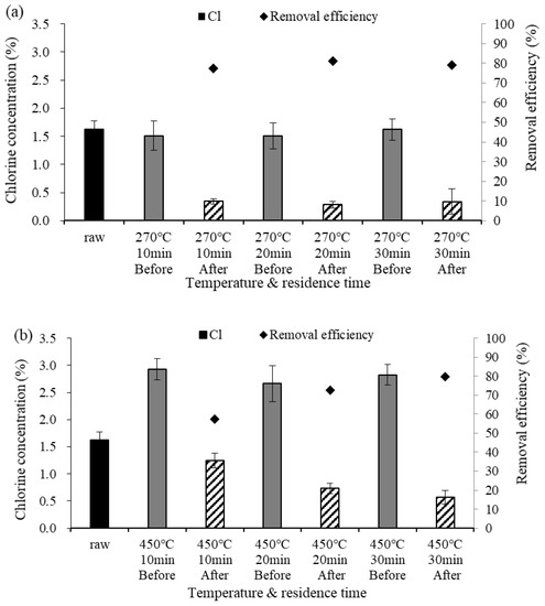 Cl concentration before and after demineralization and removal efficiency at different temperatures. Error bars represent standard deviation (n = 3), (a) 270 °C, (b) 450 °C.