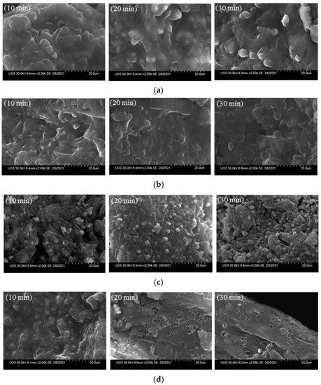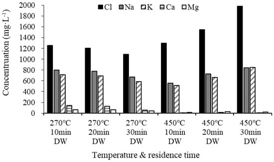 Figure 6 shows the analysis of the Cl and AAEM contents in demineralized water remaining after the demineralization of the biochar. The Cl concentration gradually decreased at 270 °C as the residence time increased, but it gradually increased at 450 °C, demonstrating that more chloride ions were eluted as the residence time increased. Na and K, which are alkali metals, were eluted in larger quantities than alkali earth metals because of their water solubility. The elution amount decreased as the residence time increased to 270 °C, but subsequently increased as the residence time increased to 450 °C. It appears that the elution amount increased with the surge in pyrolysis temperature because the relative proportions of water-soluble Na and K increased [35]. As shown in the SEM images, we found that biochar at 450 °C has a clear crystal structure due to pyrolysis at a higher temperature than 270 °C and an increase in the residence time demineralizes a large amount of salt (see Figure 5).