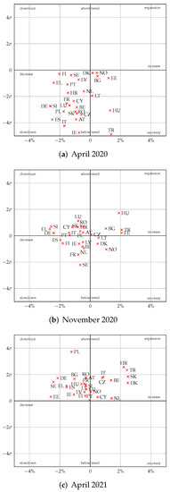 Detailed results of energy consumption cycle clocks are presented in Figure A1, Figure A2, Figure A3, Figure A4, Figure A5, Figure A6, Figure A7, Figure A8, Figure A9, Figure A10, Figure A11, Figure A12, Figure A13, Figure A14, Figure A15, Figure A16, Figure A17, Figure A18, Figure A19, Figure A20, Figure A21, Figure A22, Figure A23, Figure A24, Figure A25, Figure A26, Figure A27, Figure A28 (graphs (d)). An essential decrease in energy consumption occurred for Turkey and Ireland. Also, a noticeable change appeared in Estonia, Italy, and Austria. The magnitude of the change in energy consumption levels in April 2020 was so substantial that all analyzed economies went to the slowdown or recovery phase of their business cycle, which was below their long-term trend (see Figure 2a). In April 2021, the introduced NPIs were less rigorous. The lockdowns were not as crucial for the economy or industry as previous lockdowns. All studied countries increased their energy consumption above the trend and turned to a downturn or expansion phase. The highest increase was for Poland. Hungary and Turkey also consumed extensively more energy compared to the long-term trend (see Figure 2c).