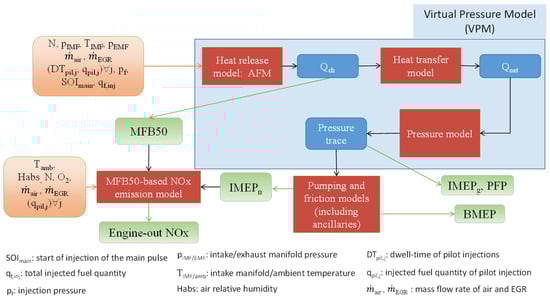 As can be seen from the schematic, the model first evaluates the chemical energy released by the fuel (Qch) on the basis of the accumulated fuel mass (AFM) approach [23,24,25,26,27] and subsequently evaluates the net heat release (Qnet) on the basis of the estimation of the heat transfer to the wall by means of a dedicated sub-model.