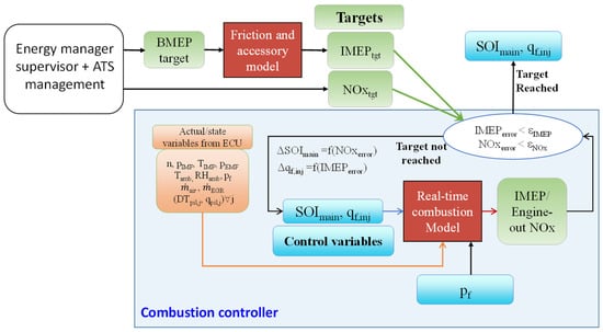 The loop uses the real-time combustion model as a virtual sensor that predicts the actual values of IMEP and engine-out NOx in real time on the basis of the main engine variables, which are provided as input, and then compares the results of the simulation with the required targets. The errors between the values estimated by the model and the targets (i.e., IMEPerror, NOxerror) are then used to correct the values of the control variables (i.e., qf,inj, SOImain), and the iterative loop stops when the errors fall below the defined threshold values (εIMEP, εNOx). When the errors are smaller than the thresholds, the calculated values of the control variables are sent to the ECU to be actuated on the real engine.